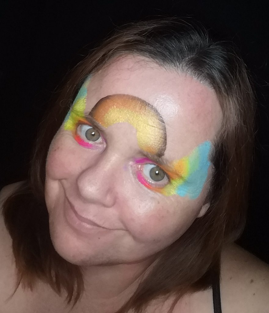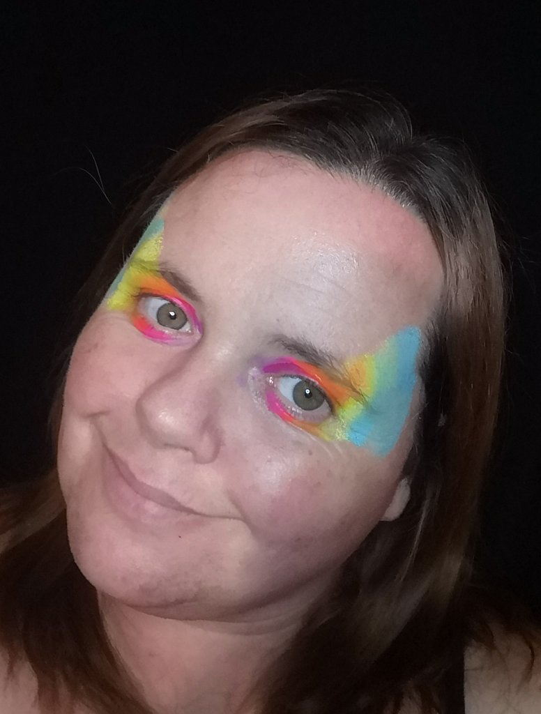 Using one of the split cakes I recommended previously, you can lay down a quick base over the eyes and bridge of the nose. If you wanted to be more suitble you could use one of the Superstar colours, which are perfect for bases! A quick poof of iridescent glitter will add the sparkle you need.