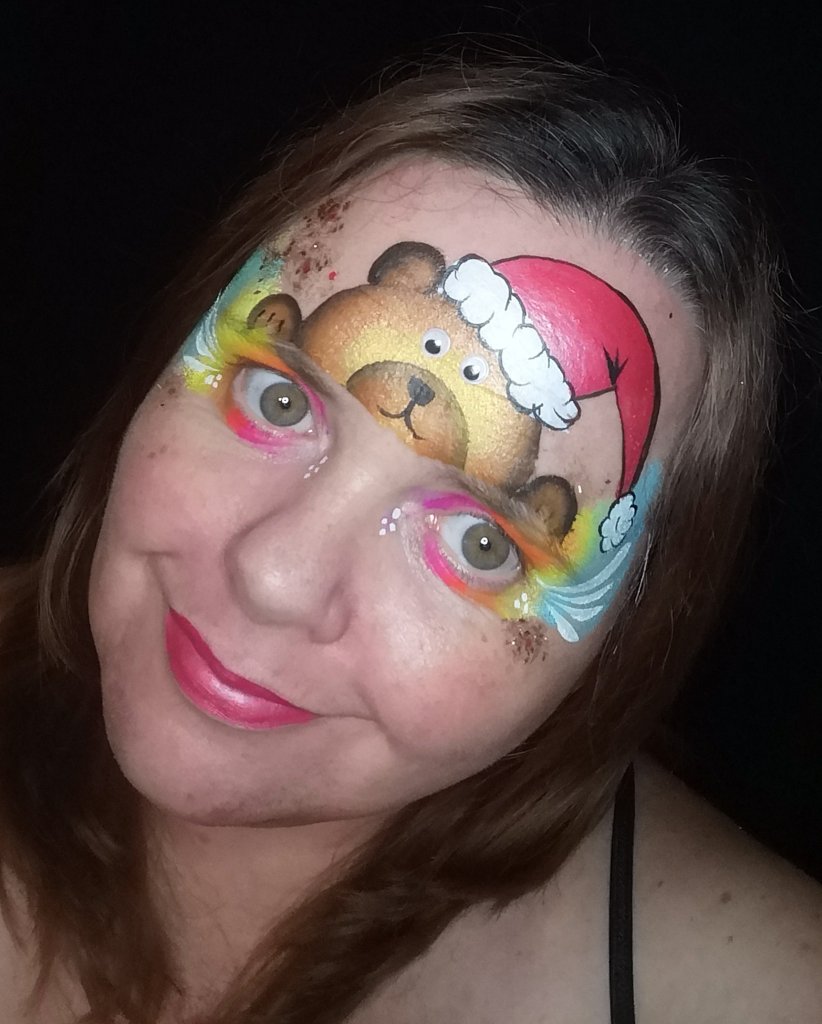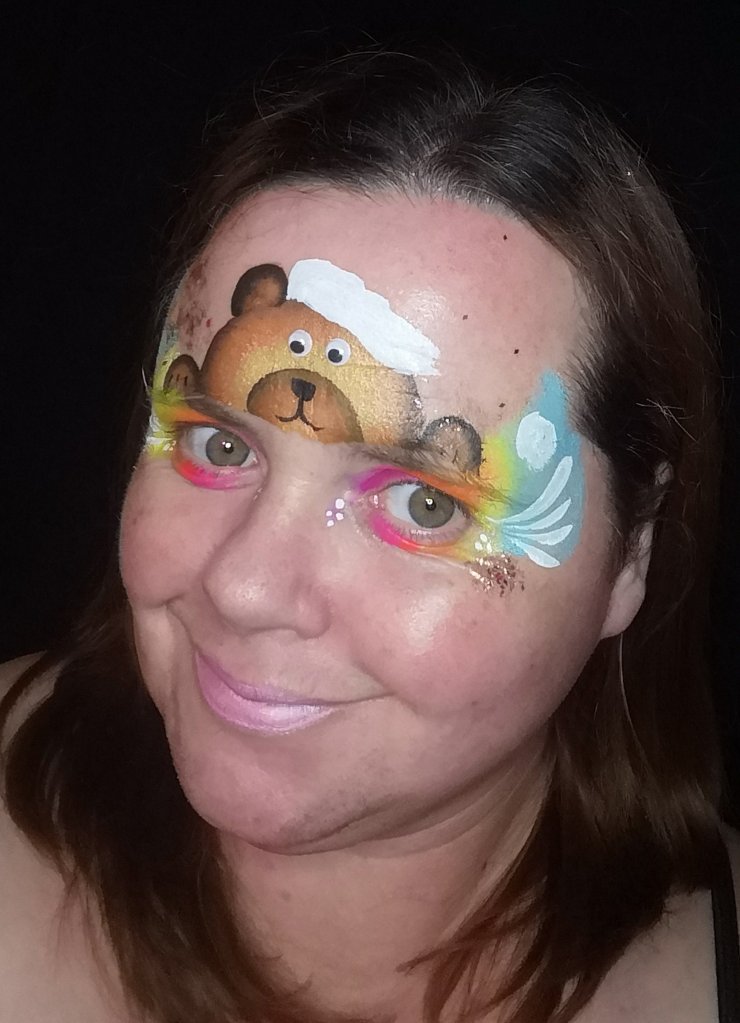 Using Fusion’s Rainbow Explosion Pallette, you can easily recreate this design. Using the brown onestroke in this set, you need to paint Mr Ted’s head. Load the 3/4″ long bristle angled brush you need to paint half a circle. Begin at the inside of one eyebrow, finishing at the other. Using the eyebrows, you’ll ensure the design is centred and balanced.