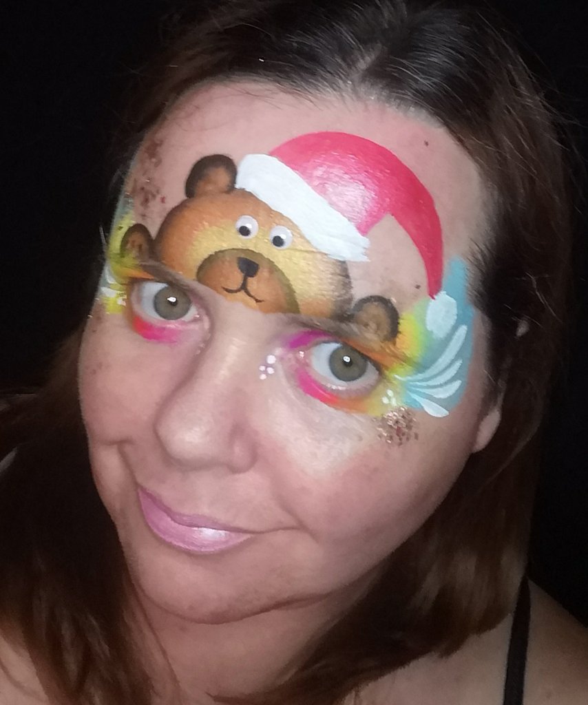 Using Fusion Black and a Number 3 Round Brush, I will add a muzzle and nose to Mr Ted, oh! and a few claws to each paw. (simply 3 lines!) A few tear drops at the corner of each eye just add to the balance of the design. The tear drops are created with Fusion white paint and a number 4 round brush. A smudge of chunky glitter and your design is complete!